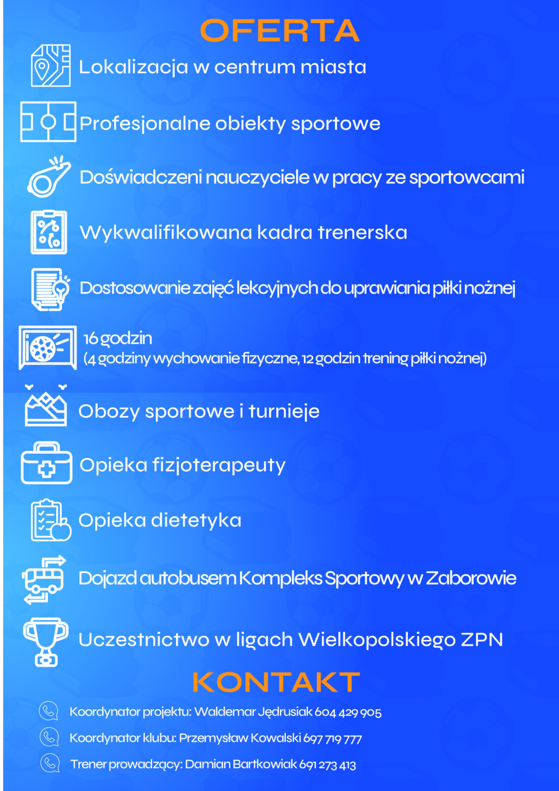 Projekt gwarantuje opiekę fizjoterapeuty oraz dietetyka, a także dbałość o odpowiednie wyżywienie dostosowane do potrzeb młodych sportowców.