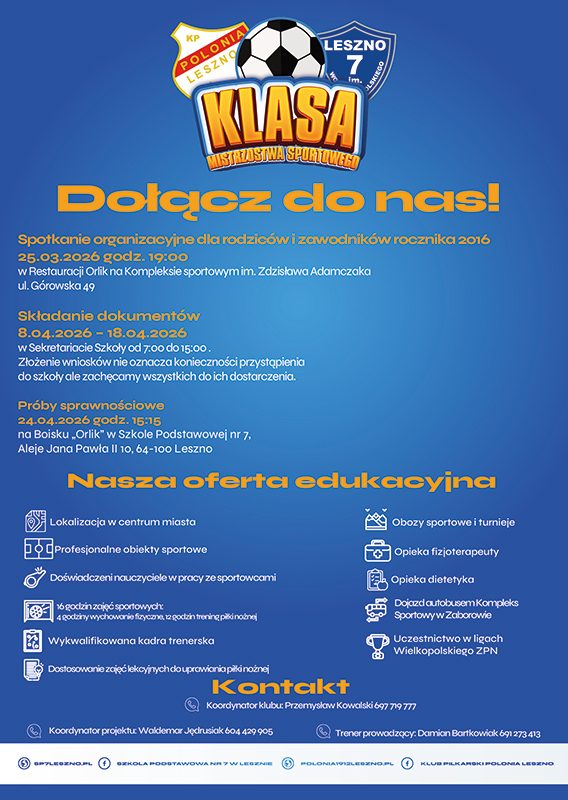 Klub Piłkarski Polonia 1912 Leszno z przyjemnością informuje o kontynuacji strategicznego projektu edukacyjno-sportowego realizowanego we współpracy ze Szkołą Podstawową nr 7 w Lesznie. Po sukcesie inauguracji pierwszej klasy Szkoły Mistrzostwa Sportowego w roku szkolnym 2025/2026, ogłaszamy nabór do kolejnego oddziału, który rozpocznie naukę we wrześniu 2026 roku.